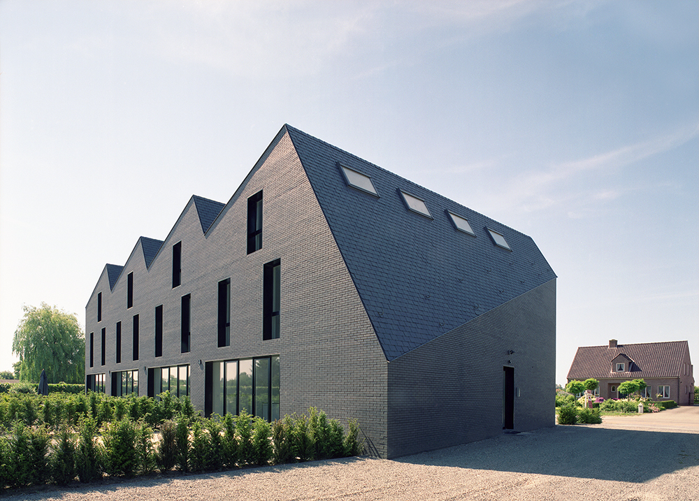 The rural monolith houses two studios at the street side on the ground floor and 4 triplex apartments with a garden. Every housing unit are accessible via a central corridor on the ground floor.
