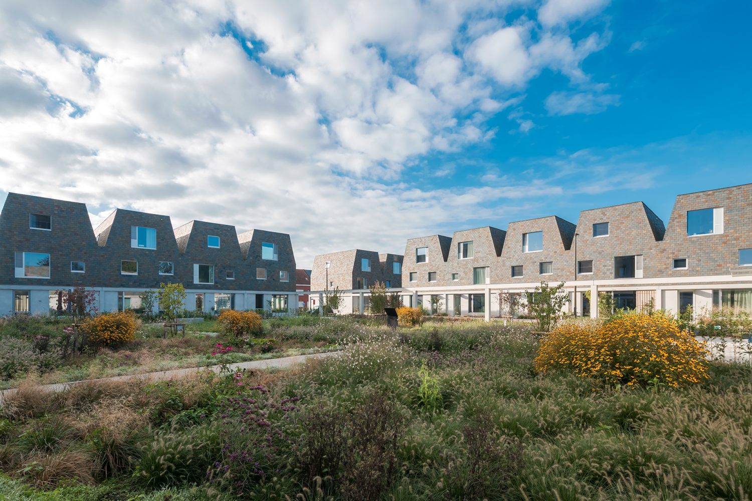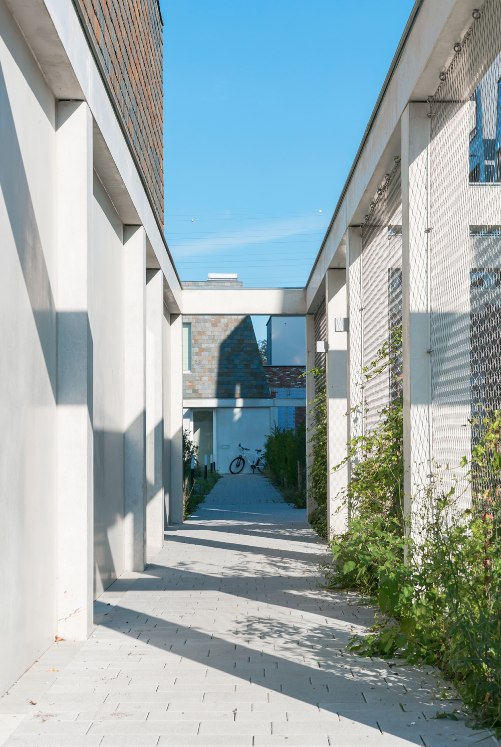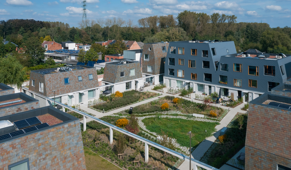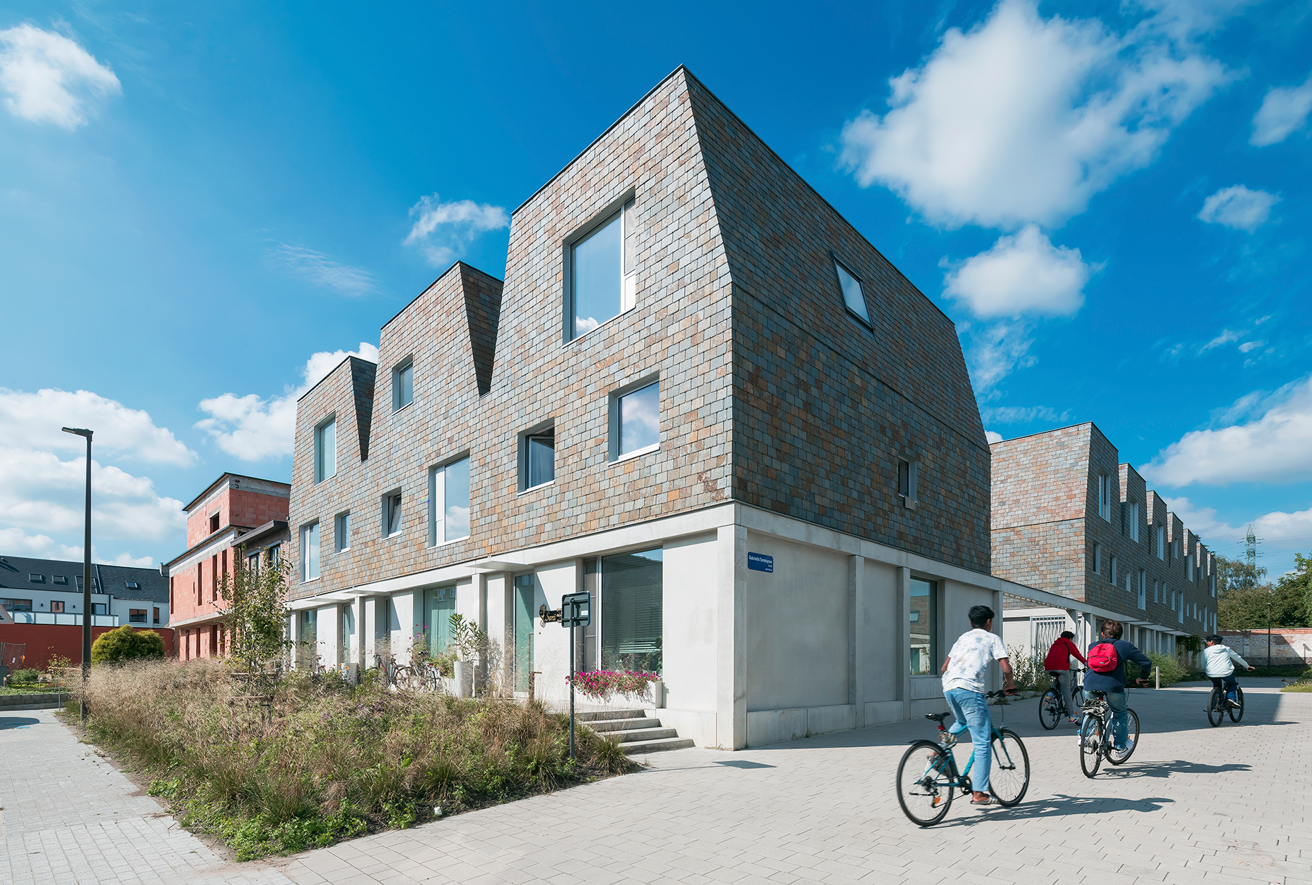 The reallocation of an industrial site in Mechelen resulted in the new Auweghem residence. dmvA didn’t design a large monolith, but a small residential village consisting of various residential typologies around a large courtyard. Diversity and individuality of living was the main focus when designing this residence with park vibe. The project with 25 apartments and 17 houses is located on a slope, which is probably related to the fact that there was once a mill situated. This discovery inspired the architect for the design of the corner building.