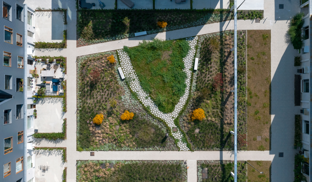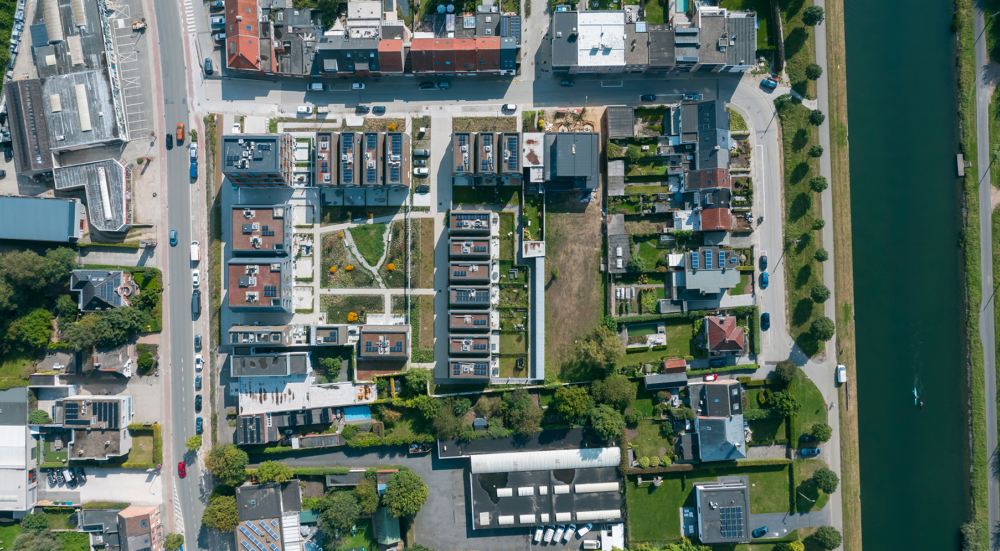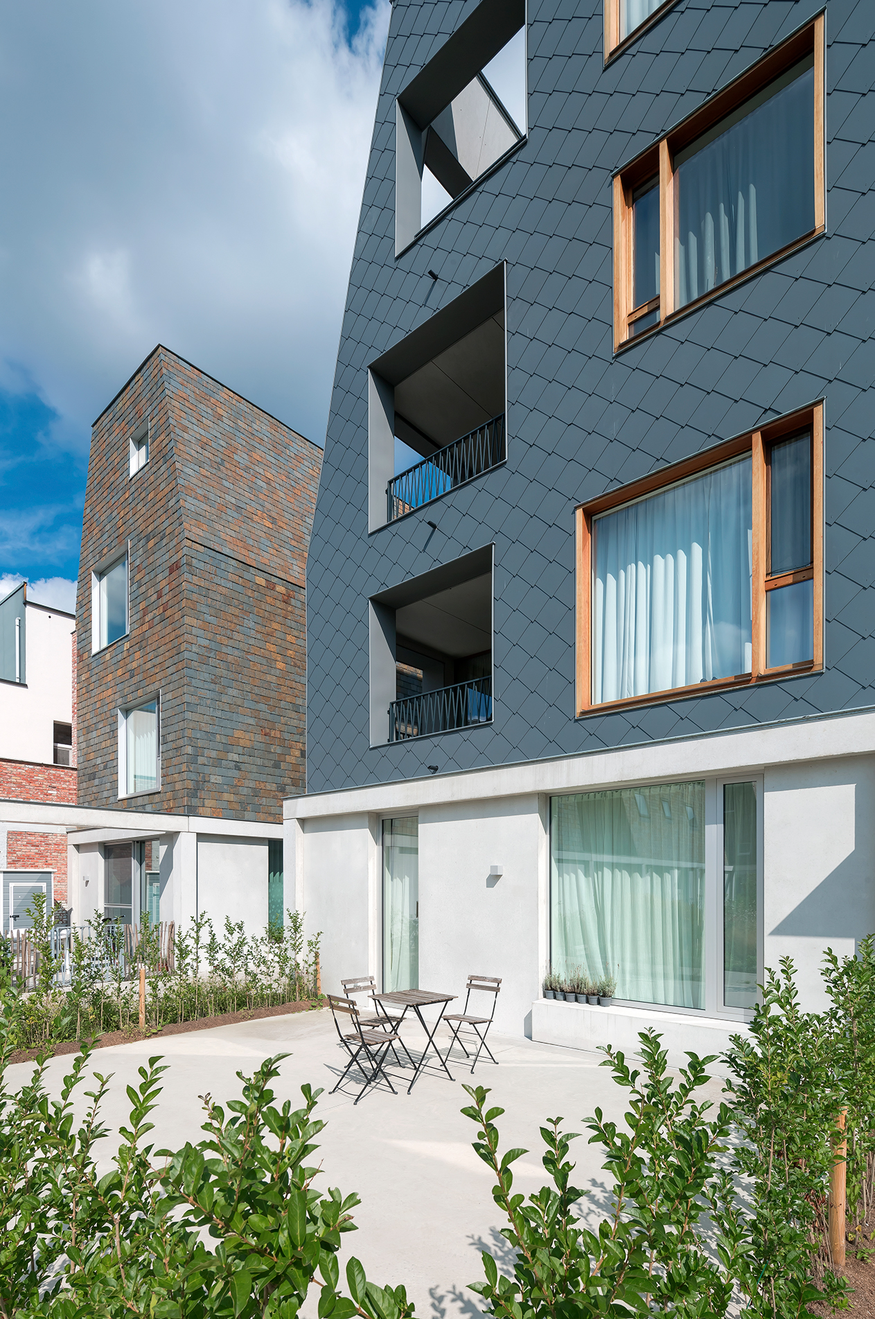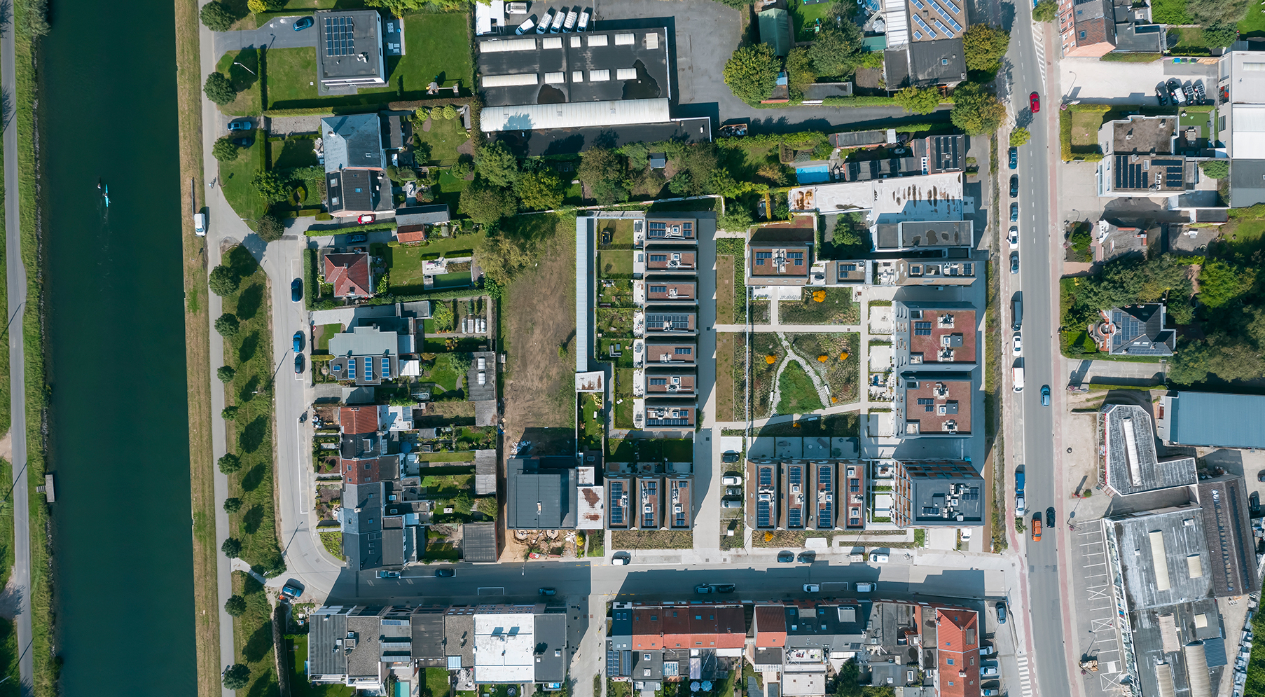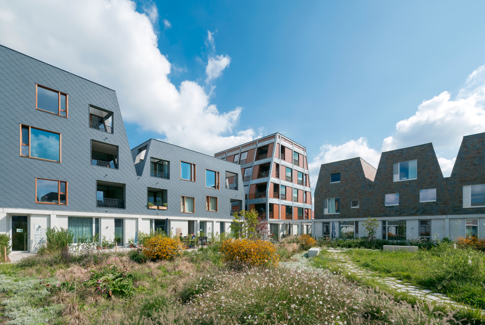 The reallocation of an industrial site in Mechelen resulted in the new Auweghem residence. dmvA didn’t design a large monolith, but a small residential village consisting of various residential typologies around a large courtyard. Diversity and individuality of living was the main focus when designing this residence with park vibe. The project with 25 apartments and 17 houses is located on a slope, which is probably related to the fact that there was once a mill situated. This discovery inspired the architect for the design of the corner building.