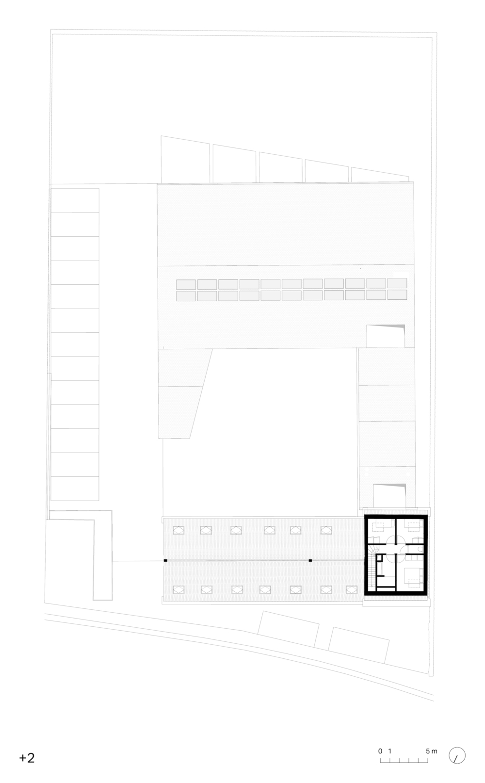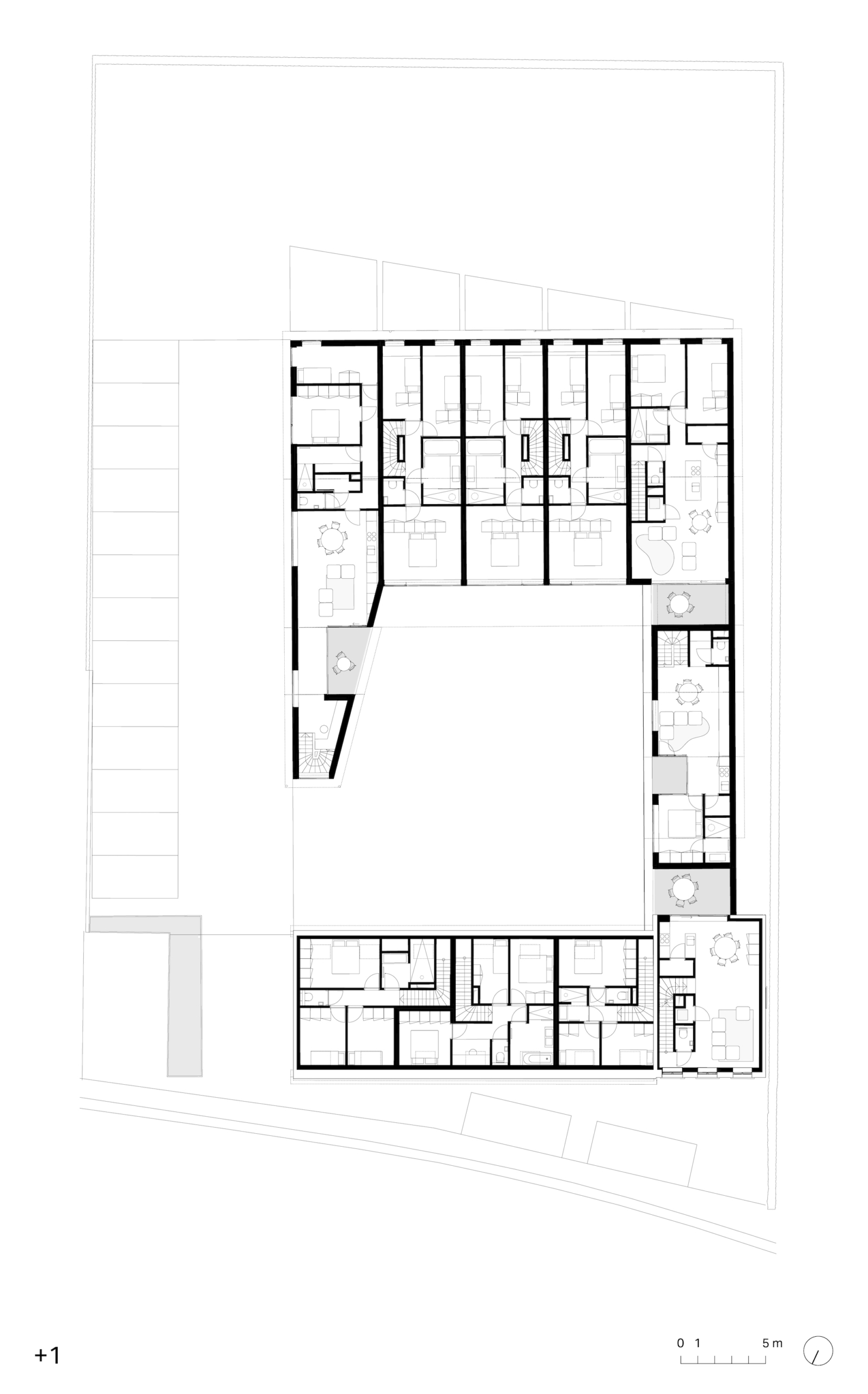 The addition of the L-shaped volume creates an inner area, the heart of the collective housing, referring to a courtyard farm. The yard connects all the residences with a loop-shaped path and provides some elements that encourage social interaction, such as a barbecue spot, a ping pong table… There is also a common room with a kitchen, a laundry room, and a sauna on the ground floor. On the first floor there is space that can be set up as a co-working place or as guestrooms. A large part of the site consists of open green space with allotment gardens, play zones, green parking spaces, a wadi and greenery that enhances biodiversity. Solar panels will provide electricity for the private homes and communal areas such as charging points for electric cars and bicycles.