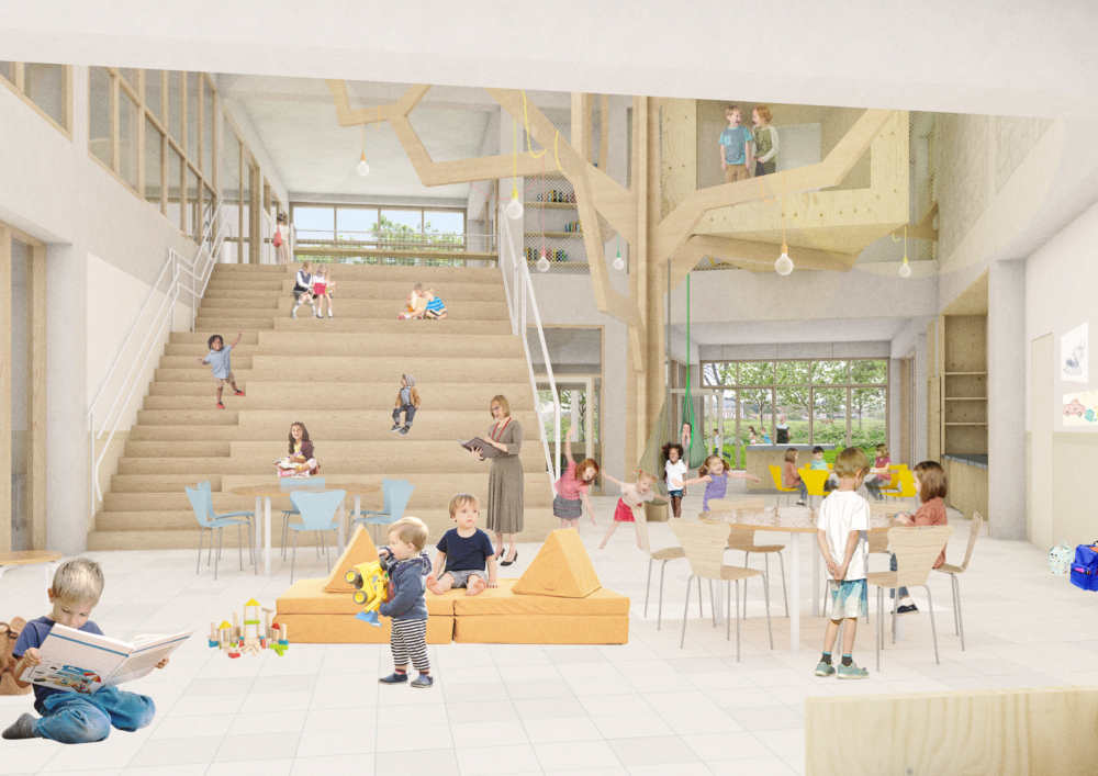 The design embraces the innovative teaching methods of GO! Leefschool Eureka. Instead of traditional classrooms, flexible learning environments are created, allowing for easy adaptation to various educational activities and group sizes. Open landscape classrooms and multifunctional spaces encourage collaboration and creativity. At the heart of the building is a double-height space, the ‘grand market,’ which serves as a central hub for interaction and connection. This space visually and physically links the classrooms with each other and the outdoors, thanks to large windows that provide abundant natural light. A strong connection to the green outdoor space was a key principle in the design of the new school. All classrooms have direct access to this open environment: ground-floor classrooms open directly to the outside, while upper-floor classrooms access it via canopies leading to outdoor staircases. This design approach supports the school’s educational vision, in which learning in close proximity to nature is an essential element.