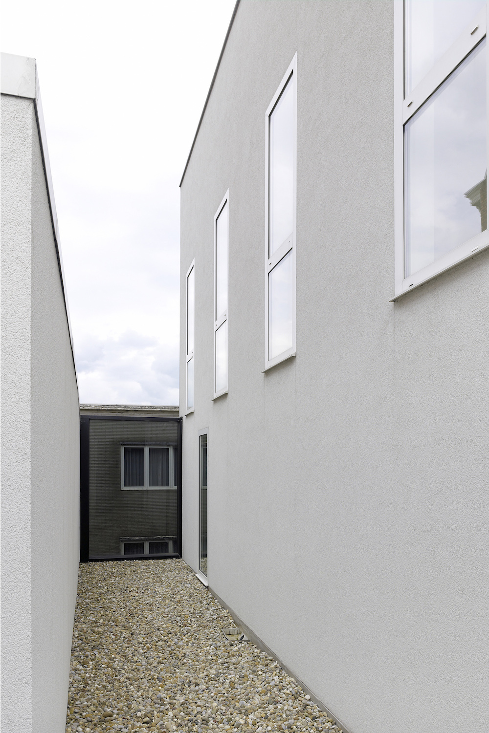 The difference in height is captured in the new building, resulting in a differentiation in the façade. The first two floors accommodate the ‘day-function’ connected by a narrow void. The upper floors with bathroom and bedrooms are narrow and the second floor leads to the walled terrace. Because of the new side façade, the urban dwelling expresses itself not only as a two-dimensional façade, but as a sculptural multi-storey house in the streetscape.
