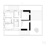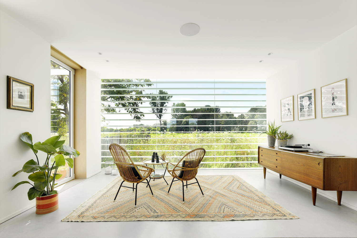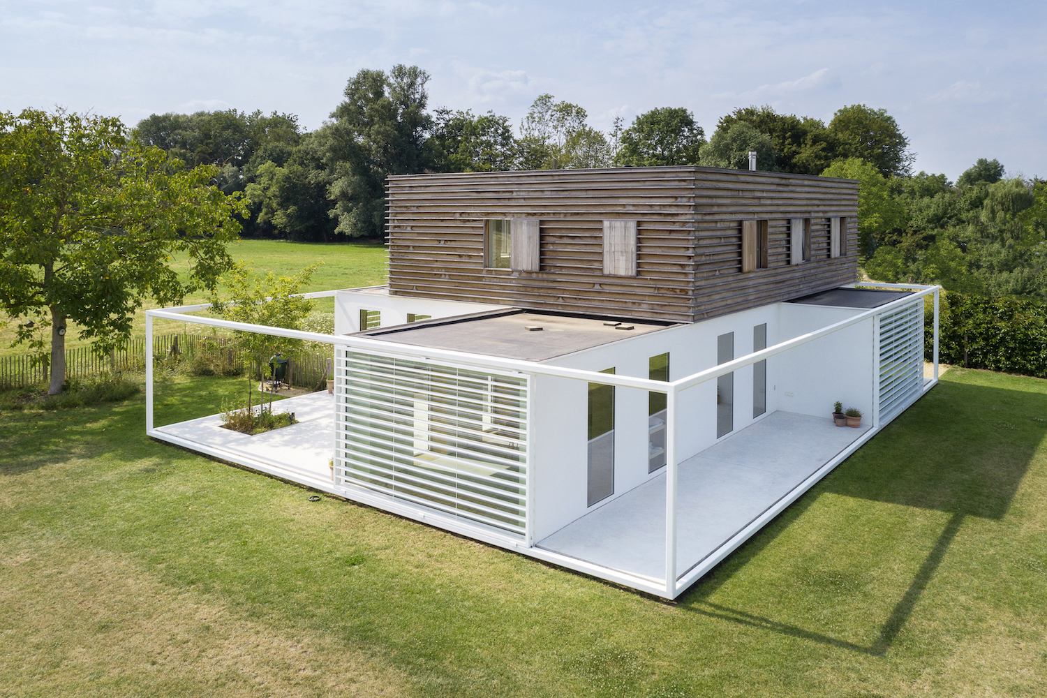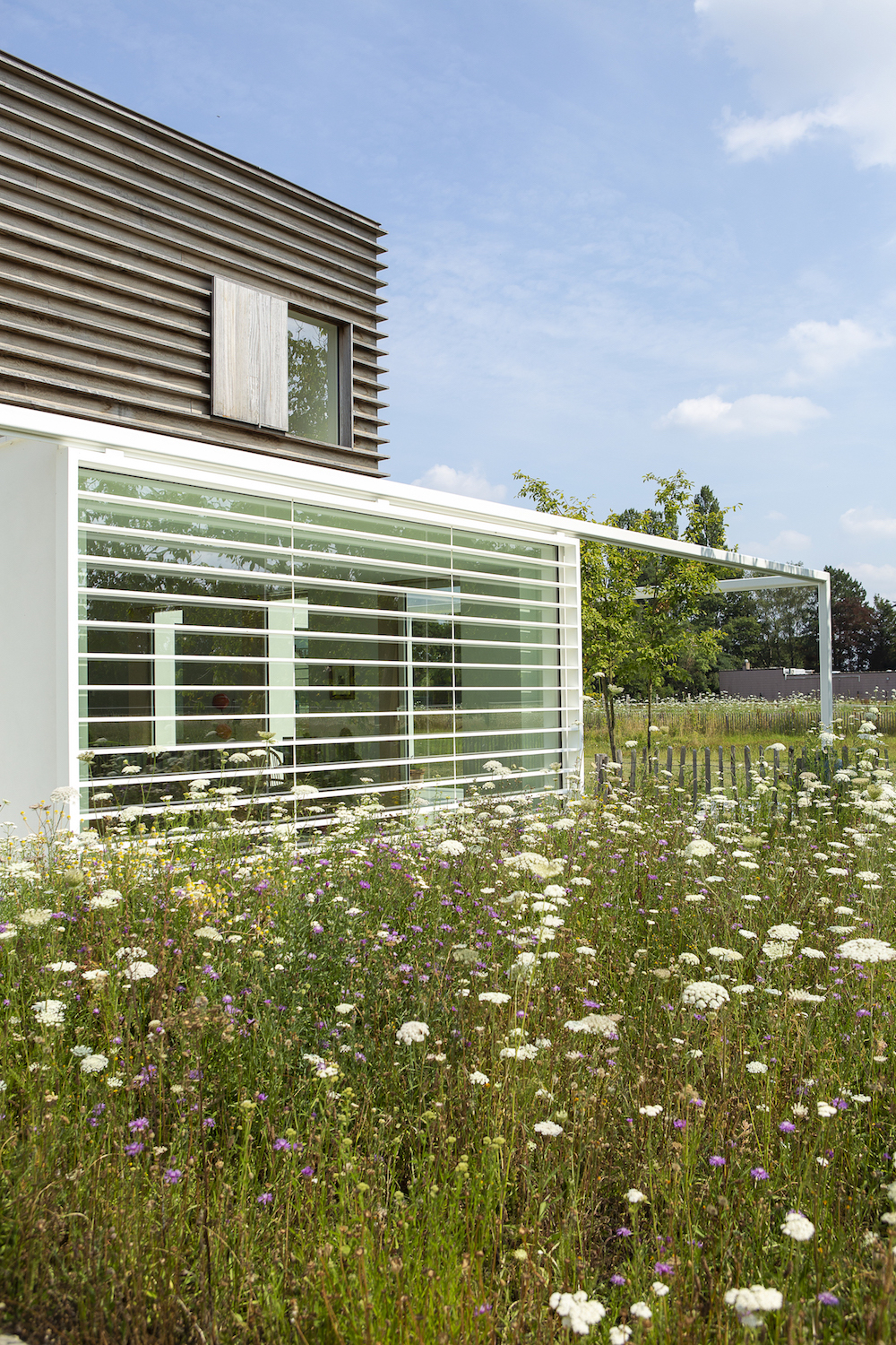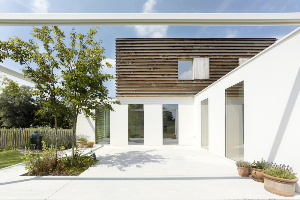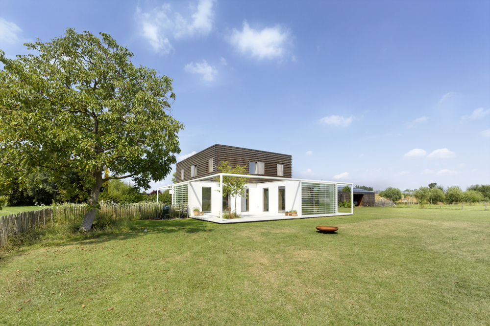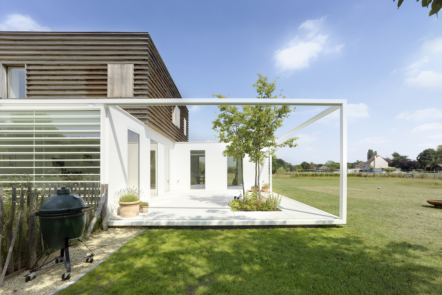 The existing building is bordered by a floating platform. A white steel frame creates and defines the indoor and outdoor spaces. Because of the positioning of the ‘canvasses’, terraces and patios are created that maximize the experience of living in the countryside.