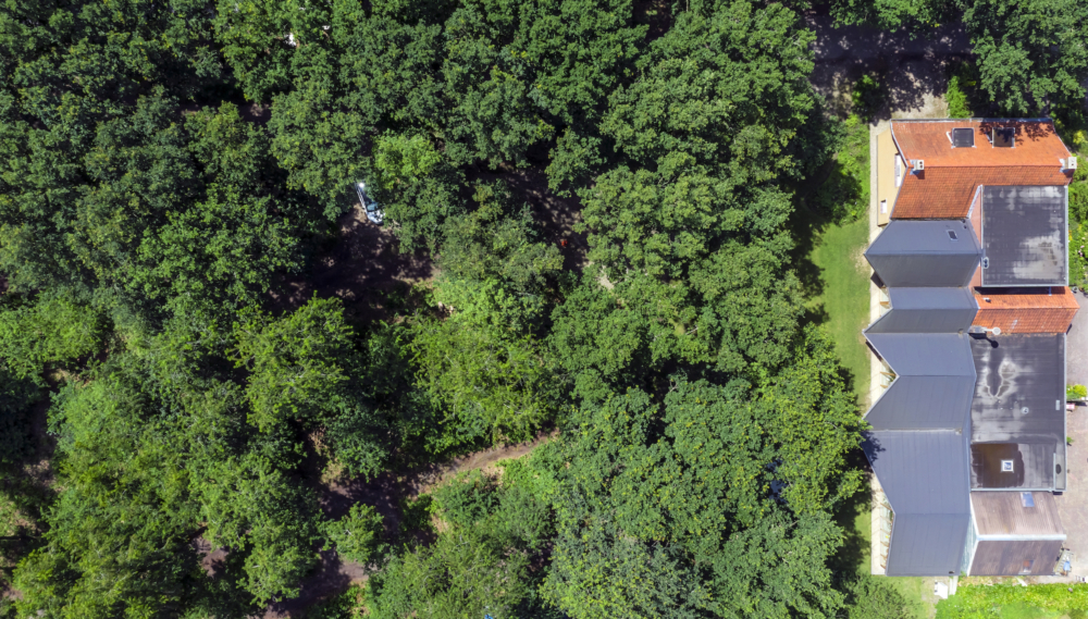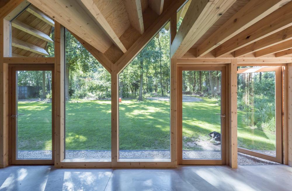 The creation of this house is done as sustainably as possible. The main material chosen was wood so that the building structure could be prefabricated. The new building was designed as compact as possible and has a green roof that strengthens the relation between the house and its surroundings. The surrounding forest was fully preserved and even extended to the house. The existing front building has also been preserved and is now used as a workspace.