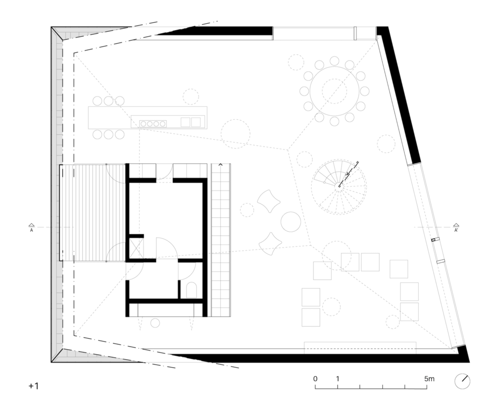 Because of reasons of privacy and the south orientation of the street, dmvA proposed living on the upper floors, under the hip roof, the symbol of shelter. The entrance, a private office, the garage, sleeping rooms and bathrooms are situated on the ground floor. A monumental white straight staircase leads to the spatial light living room with open kitchen, organised around a white volume with storage room. Marvellous window views on the green neighbourhood characterise the loft-like living room. A spiral staircase leads to the second floor, a multi-purpose room adjacent to the extraordinary intimate roof top terrace, a zen-like outer space. The use of white lacquered zinc for both roof and walls reinforce the house as an icon in nature.
