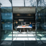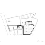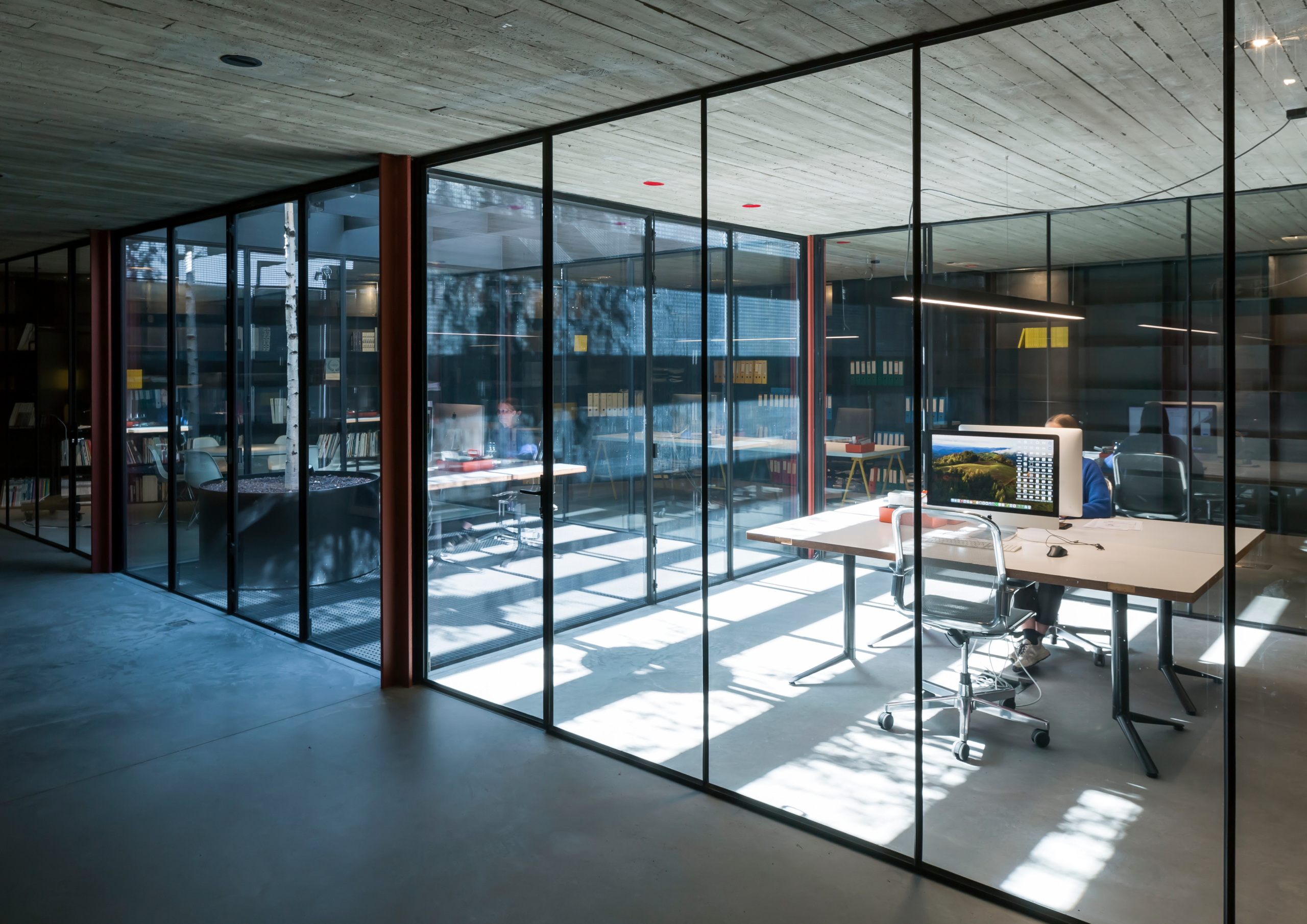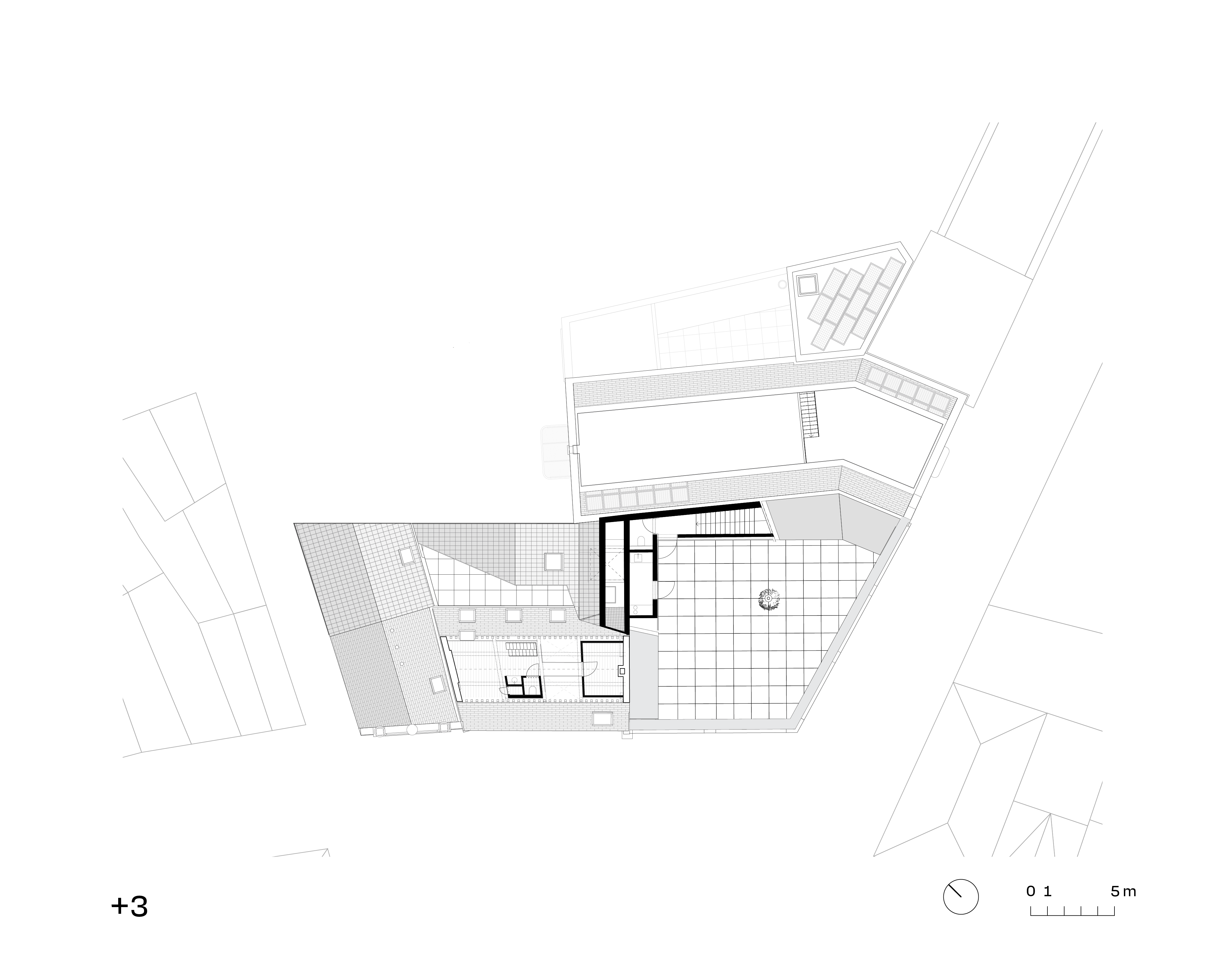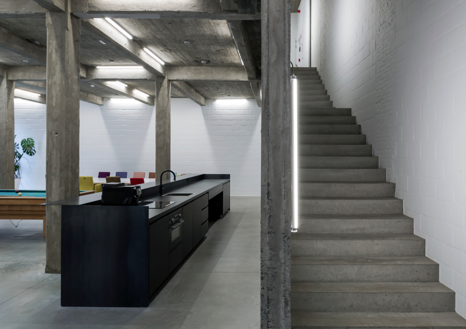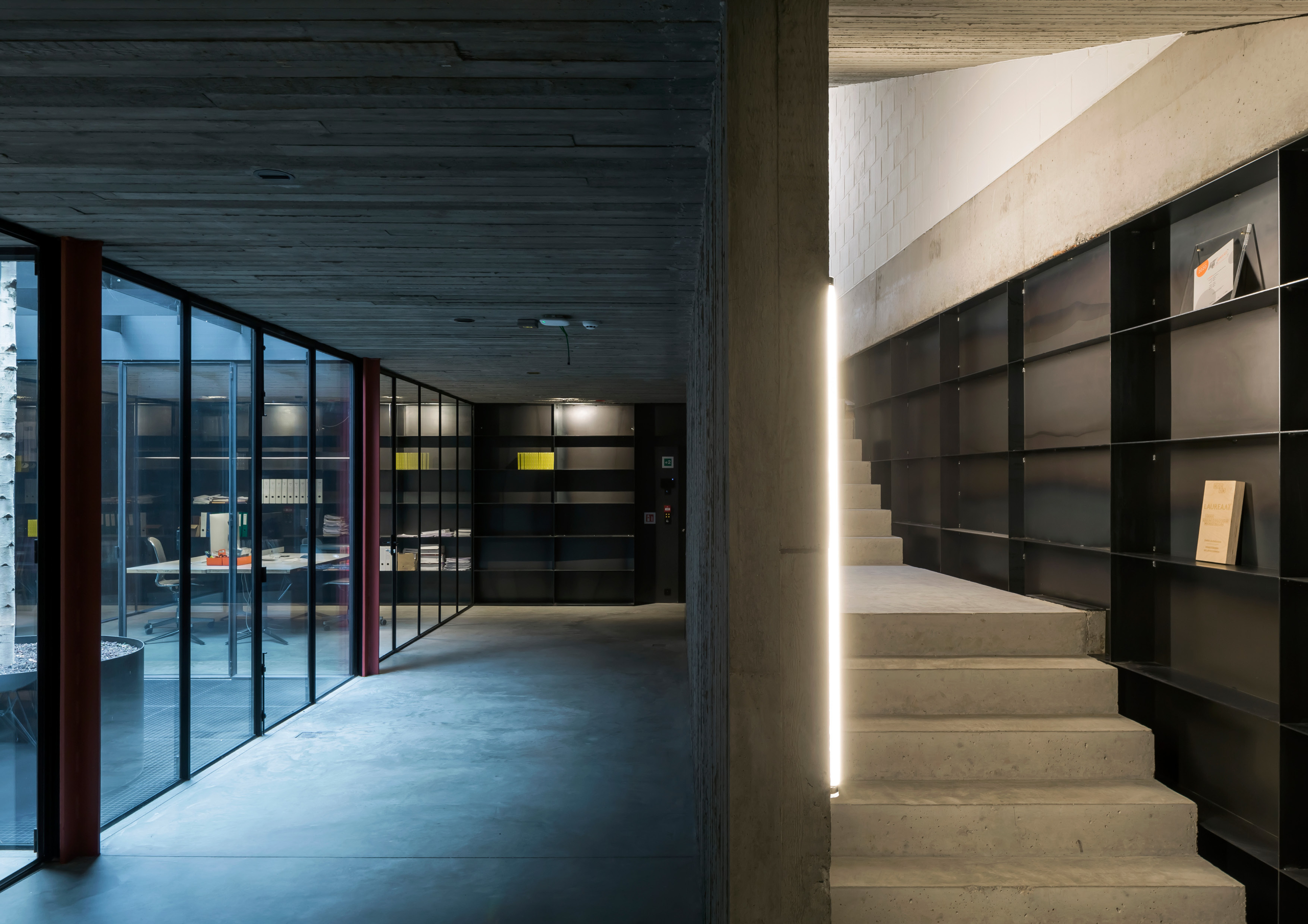 Drijhoek, the corner building, houses the dmvA office. As the building lacked separate circulation, the only intervention was adding a concrete wall with a staircase for vertical circulation, spanning from the basement to the rooftop terrace. Each floor has its unique character, making the circulation feel like a journey through different atmospheres. The ground floor is a bright multipurpose space for meetings, lunches, and recreation. The first floor features an open studio space, while the second floor includes two office spaces and a meeting room surrounding a patio that provides light and greenery. The rooftop terrace offers views of the Saint Rumbold’s Tower and serves as a pleasant spot for lunch breaks and relaxation. The surface is also ideal for urban farming.