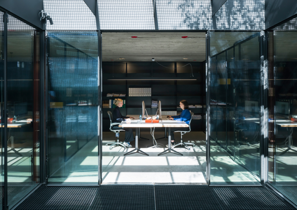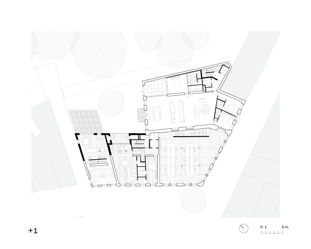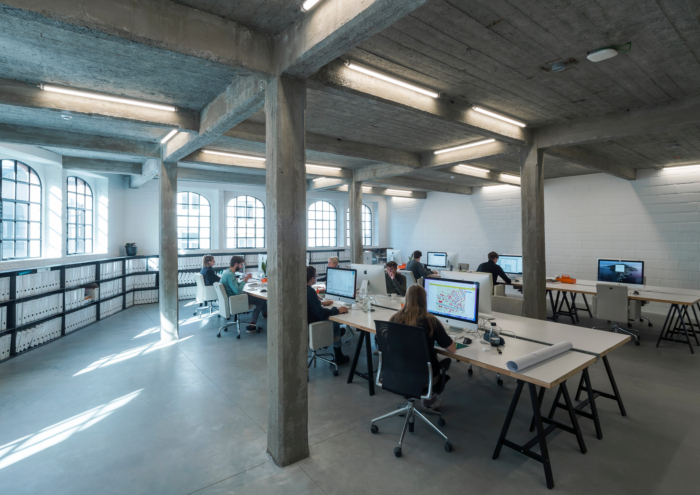 Initially, the site was fully built up, with buildings physically but not functionally connected. The structures were re-divided into four unique entities and individually restored. To ensure the site’s sustainability, shared circulation and outdoor spaces were introduced. A shared elevator and staircase were added, simplifying future functional changes. A filled-in waterway along the building will soon be reopened, creating a beautiful visual connection with the communal garden. In addition to historical reuse and intelligent shared spaces, the buildings were upgraded with sustainable installations like a geothermal heat pump and solar panels.