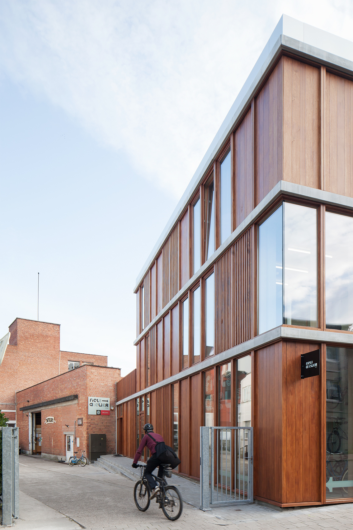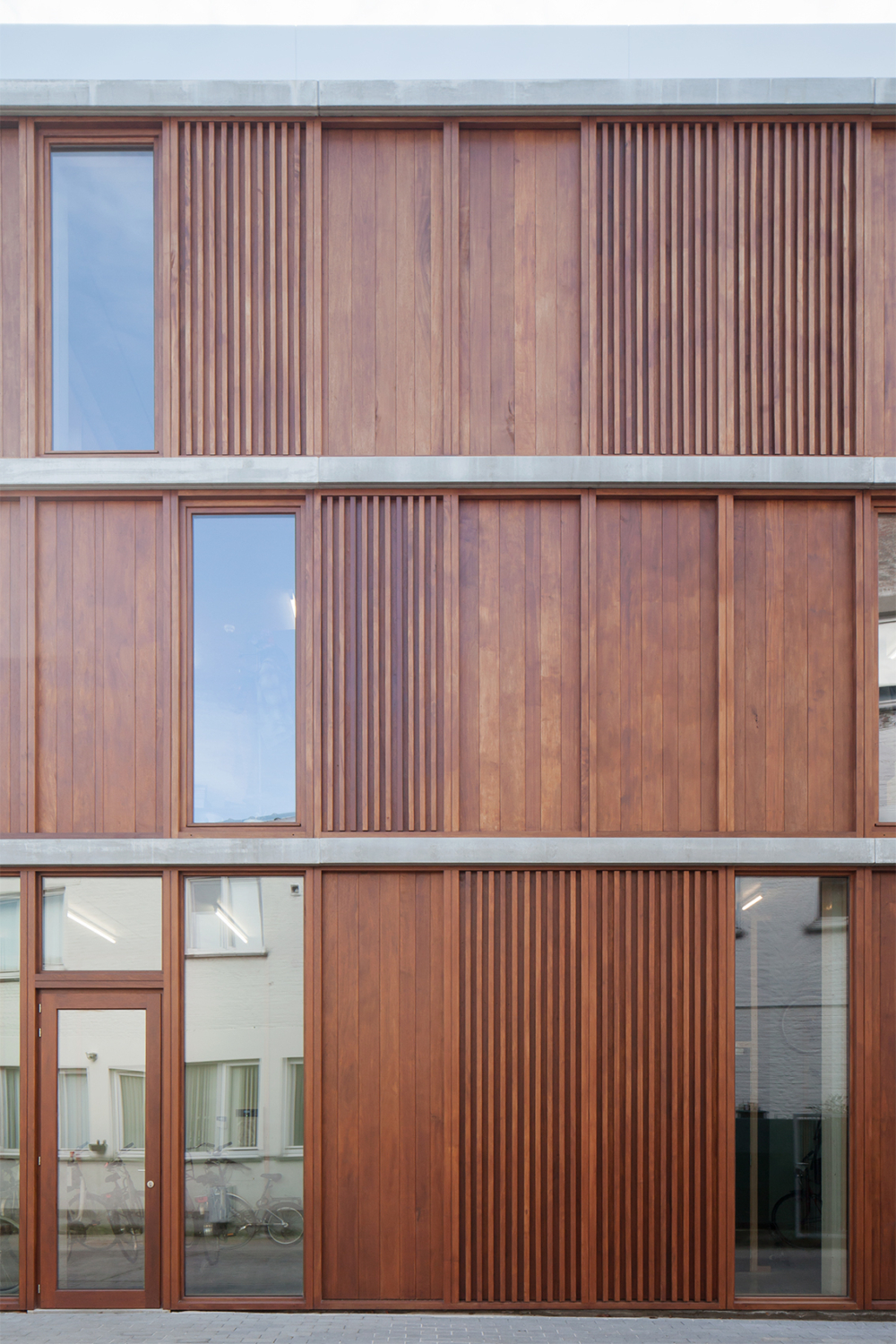 The new building is the first step in the development of a social network in an area nearby one of the poorest districts in Flanders. This is an extra incentive for the government to invest further in the neighborhood after all the efforts made by ‘t Atelier. The nearby area of the site will be expanded with 300 houses and has therefore a lot of potential. Participation was one of the biggest cornerstones in the socially engaged project. Twenty years ago, dmvA was one of the first to believe in the sheltered workshop ‘t Atelier and integrated various woodwork projects from ‘t Atelier into their designs. From this a bond of trust originated between the architect and the client and it resulted in a number of collaborations. For the new building dmvA also had the wish to collaborate intensely with the people from the wood workshop with the aim to highlight the woodworkers’ ability by constructing their own building. All the joinery, from interior to the interior, was developed in wood and was designed in such a way that it could be executed by the atelier itself. The flexibility of the concrete building structure made it easy to be filled in by ‘t Atelier. This resulted in a fantastic work process between the client and the architect, both striving for a high-quality outcome. The pride of the people of ‘t Atelier was the cherry on top.
