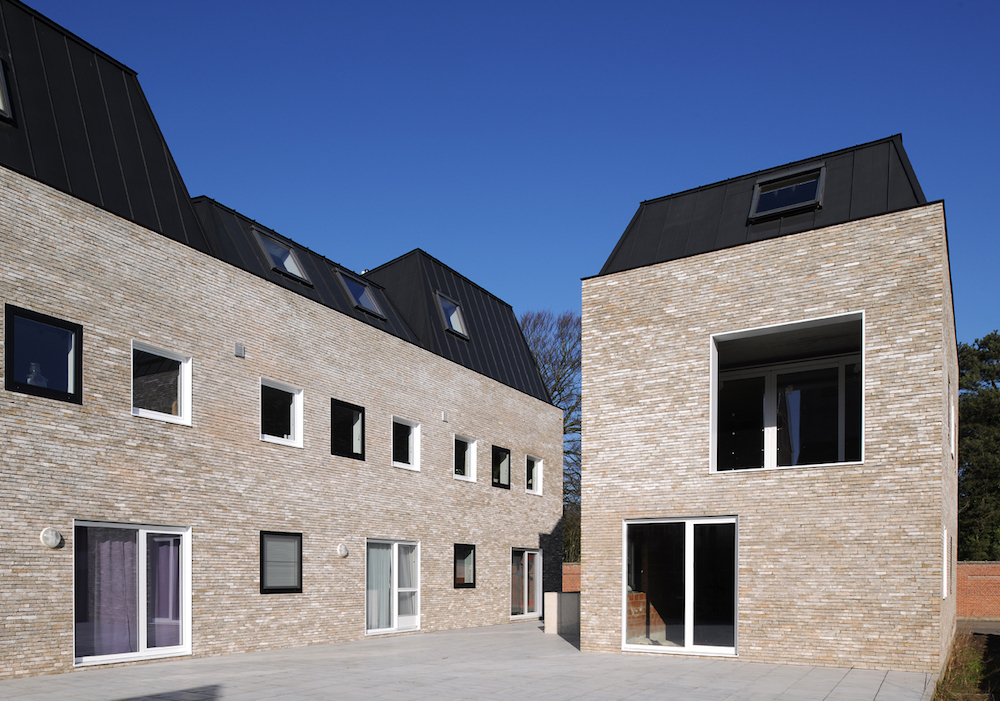 On this base you find a detached building volume at the Dynastiestraat and three linked volumes along the village green. These volumes both limit and connect the different streets, village squares and outdoor spaces. The materialization in sand coloured brick of both facades and socle enhance the sculptural character of the project.