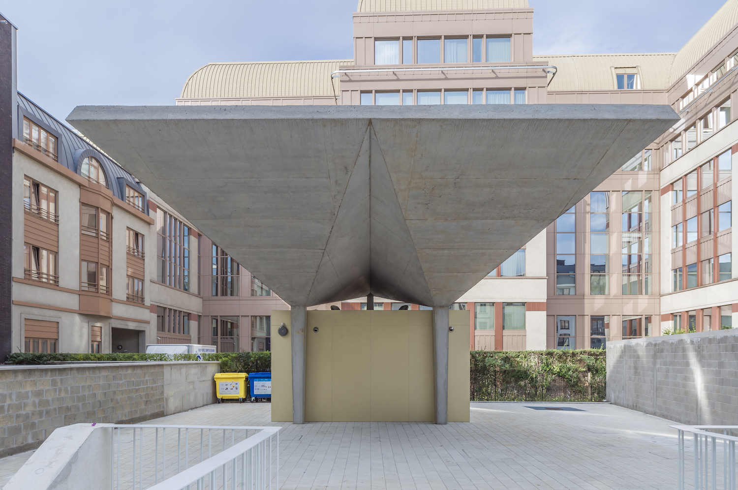 Om het uitgebreide programma op het beperkte perceel te organiseren werden de functies logisch op elkaar gestapeld. Hierdoor kon er ook maximaal ingezet worden op het creëren van buitenruimte. Zowel op het gelijkvloers als op het dak werd een speelplaats voorzien.