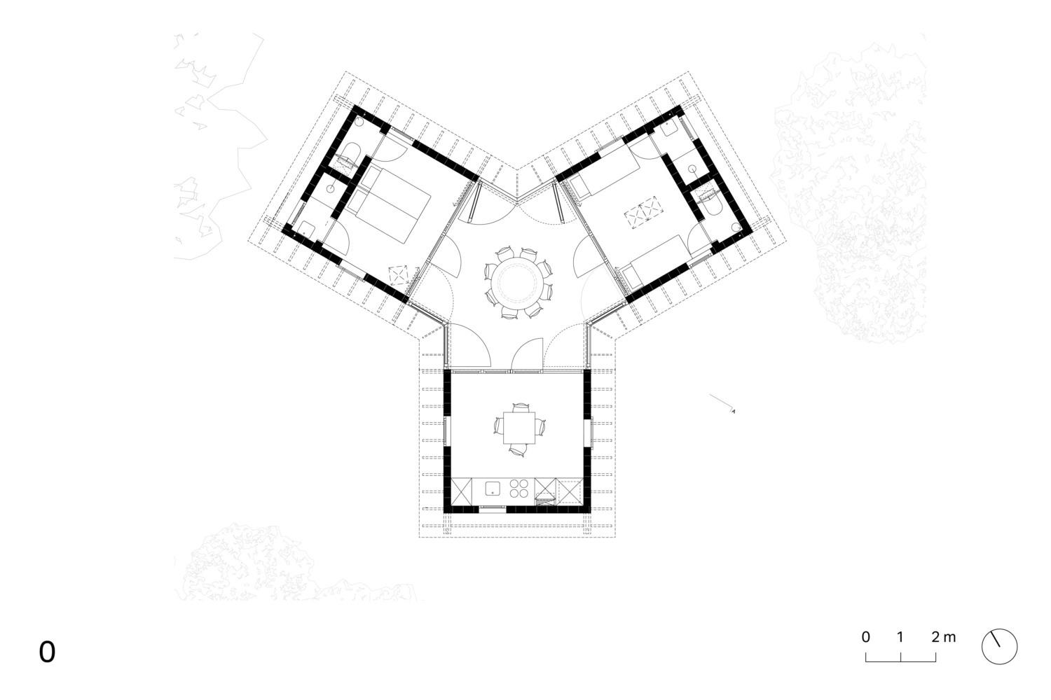 Conceptueel is het grondplan van de woning gebaseerd op de vorm van een klavertje drie. Drie volumes bestaande uit 2 slaapkamers en een keuken worden ingeplant rond een gemeenschappelijke ruimte, die zowel kan gebruikt worden als leefruimte of als overdekte buitenruimte. De centrale ruimte van het paviljoen is van vanaf elke zijde van het domein zichtbaar is vrij toegankelijk voor iedereen.