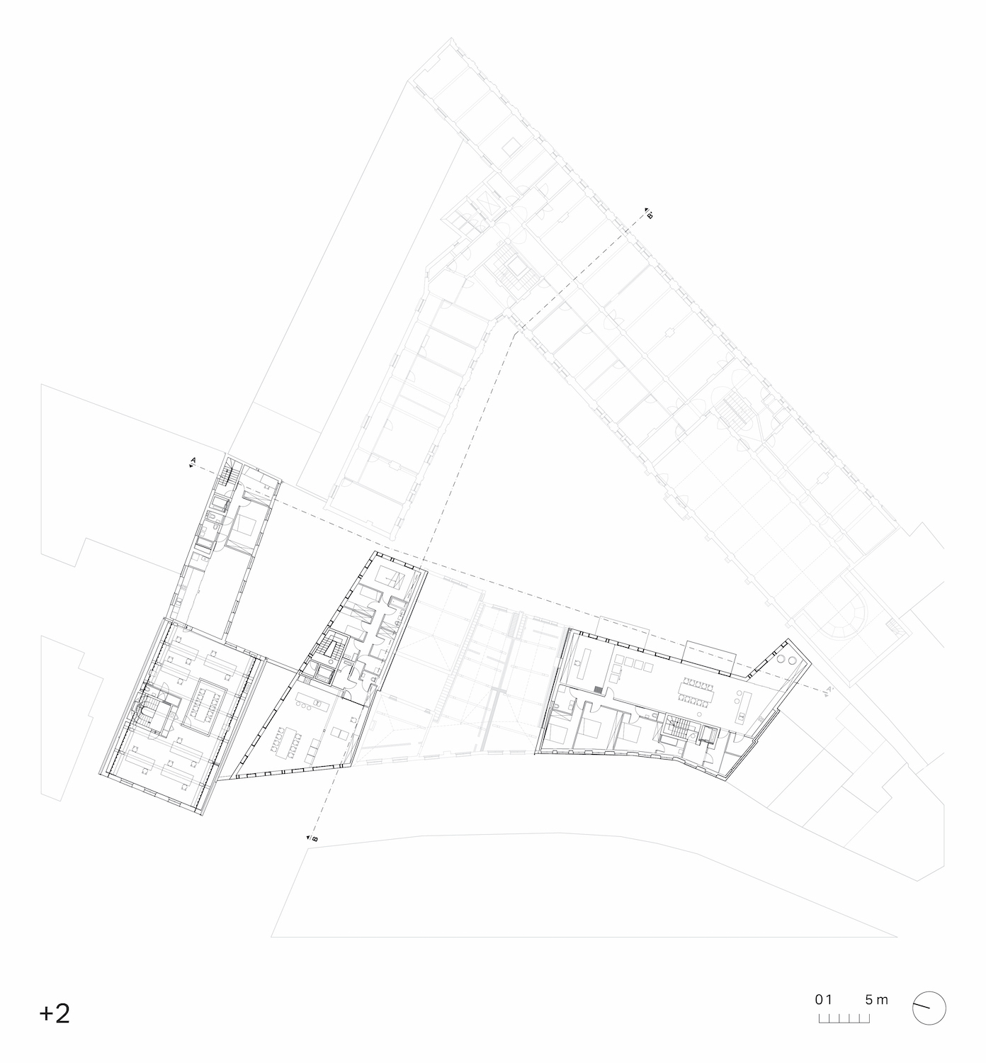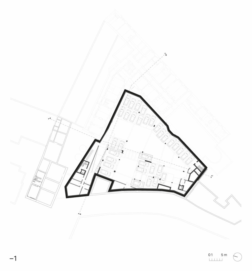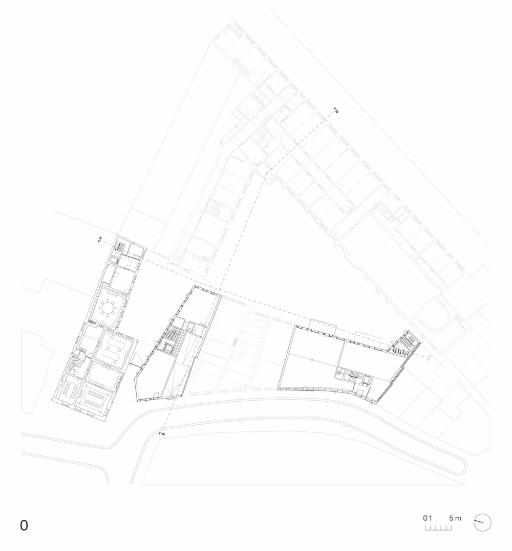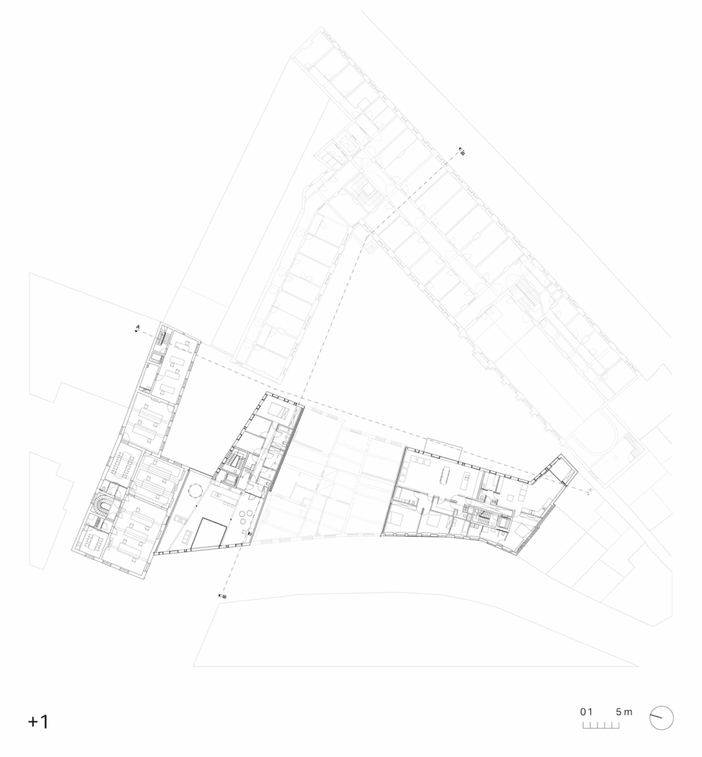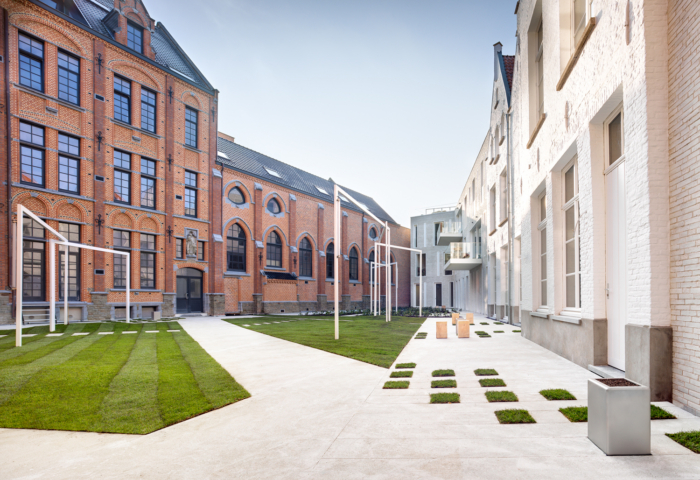 Het binnengebied, dat historisch fungeerde als kloostertuin en later als schoolspeelplaats, vormt het ruimtelijke hart van het project. Deze open ruimte bleef doorheen de geschiedenis een rustpunt binnen de dense stedelijke context. Ook in de nieuwe invulling wordt dit karakter behouden en versterkt.