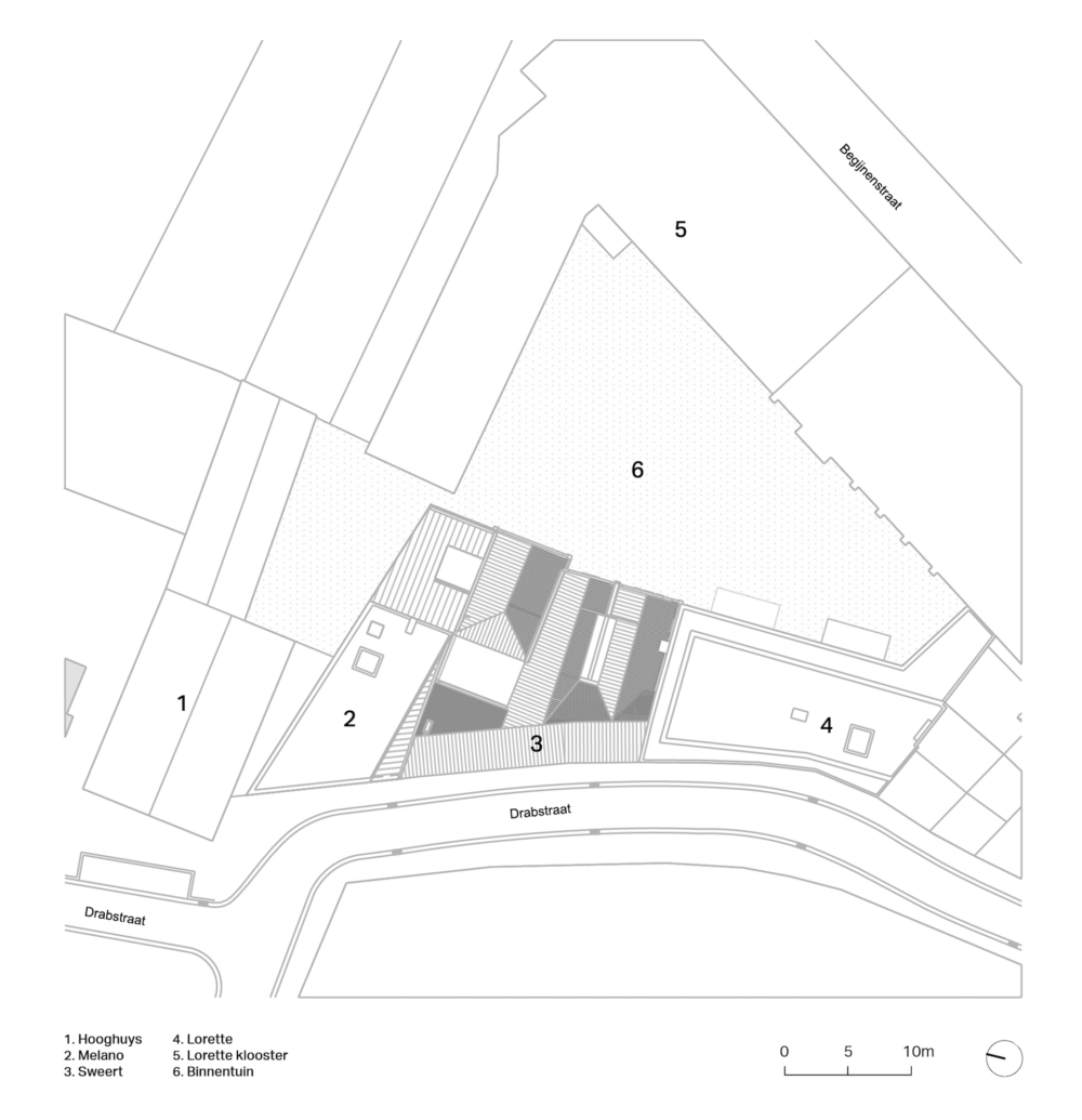 In plaats van het gebied te verkavelen in private tuinen, werd bewust gekozen voor een semi-publieke, collectieve buitenruimte. De nieuwe achtergevels samen met de drie gerestaureerde historische puntgevels van ’t Sweert en de gerestaureerde neogotische gevels van de kapel en het kloostergebouw omkaderen het binnengebied en creëren een menselijke architectuur zonder de ruimtelijke samenhang te verstoren. De synergie tussen oud en nieuw verstrekt de historiciteit van de site.
