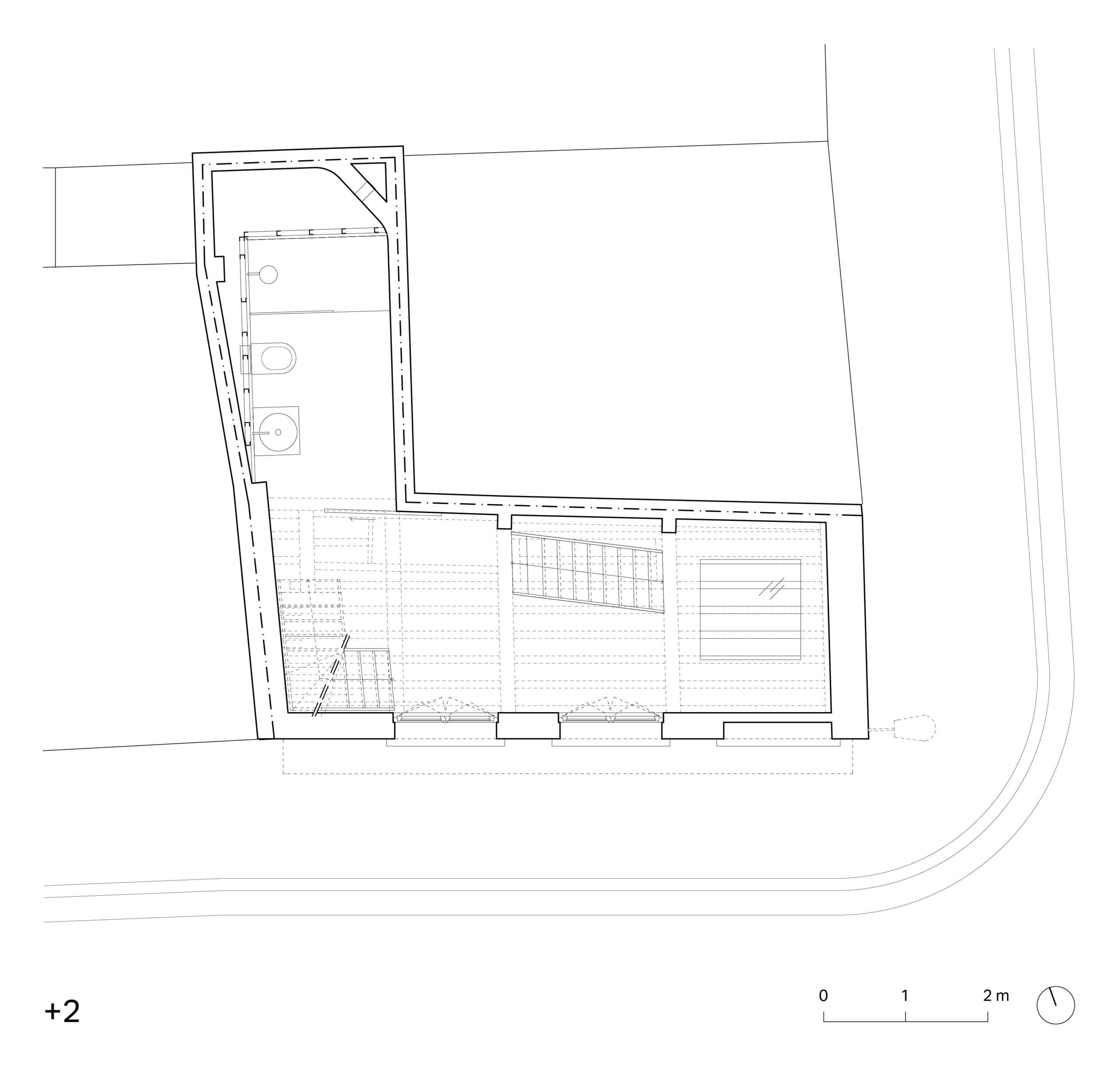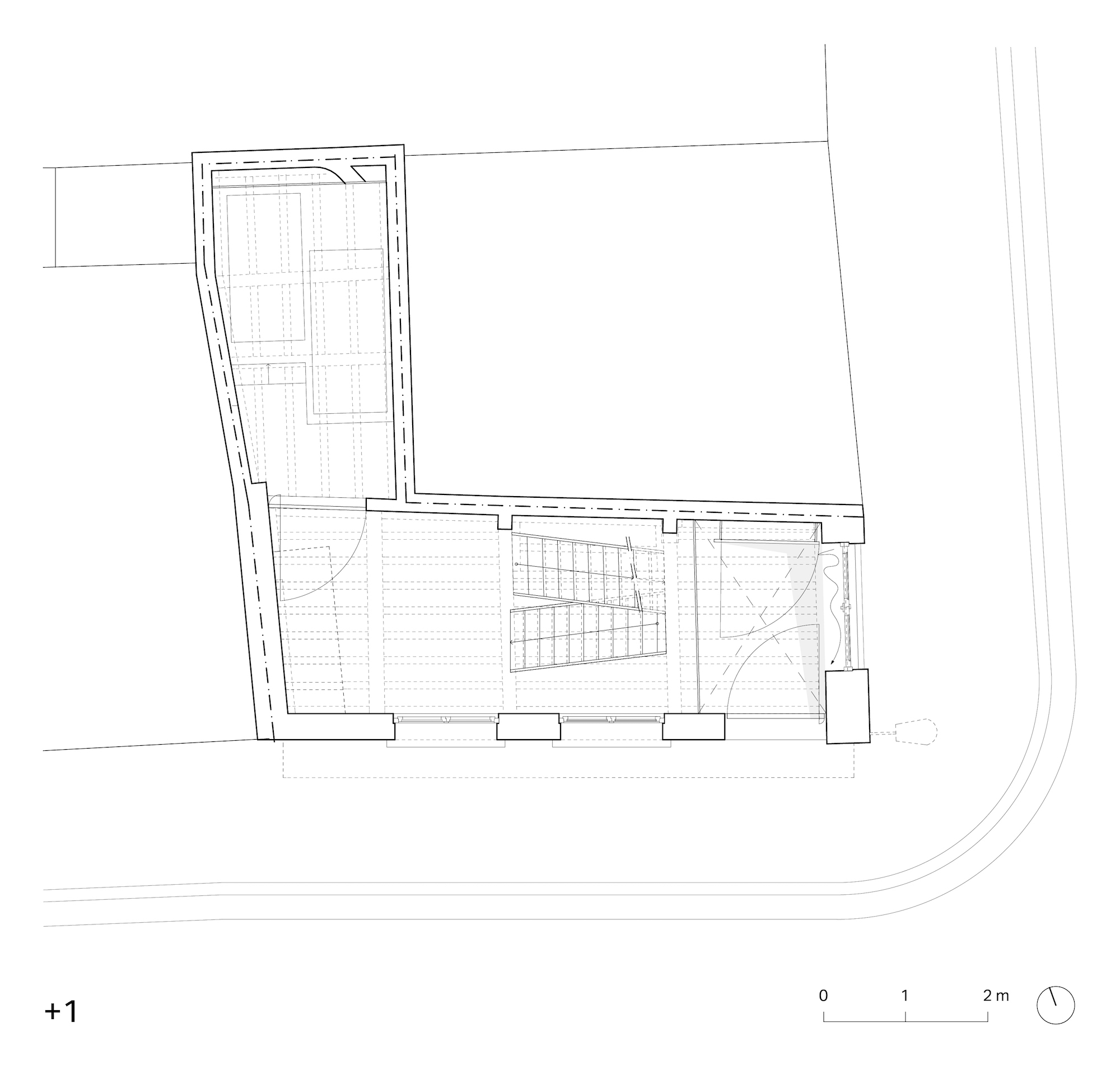 Het L-vormig grondplan kan opgedeeld worden in het 17e eeuwse diephuis enerzijds en de ingesloten annex anderzijds. Uit respect voor de erfgoed waarde van het hoekhuisje worden respectievelijk kitchenette, badkamer en sauna ondergebracht in de annex, terwijl het historische volume volledig wordt voorbehouden voor circulatie en verblijfsfuncties.