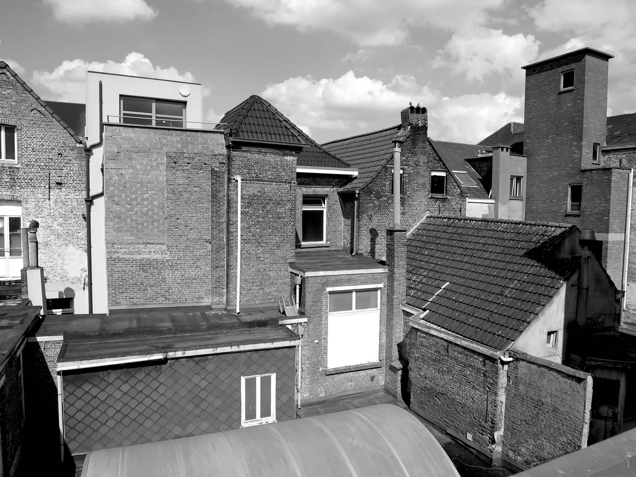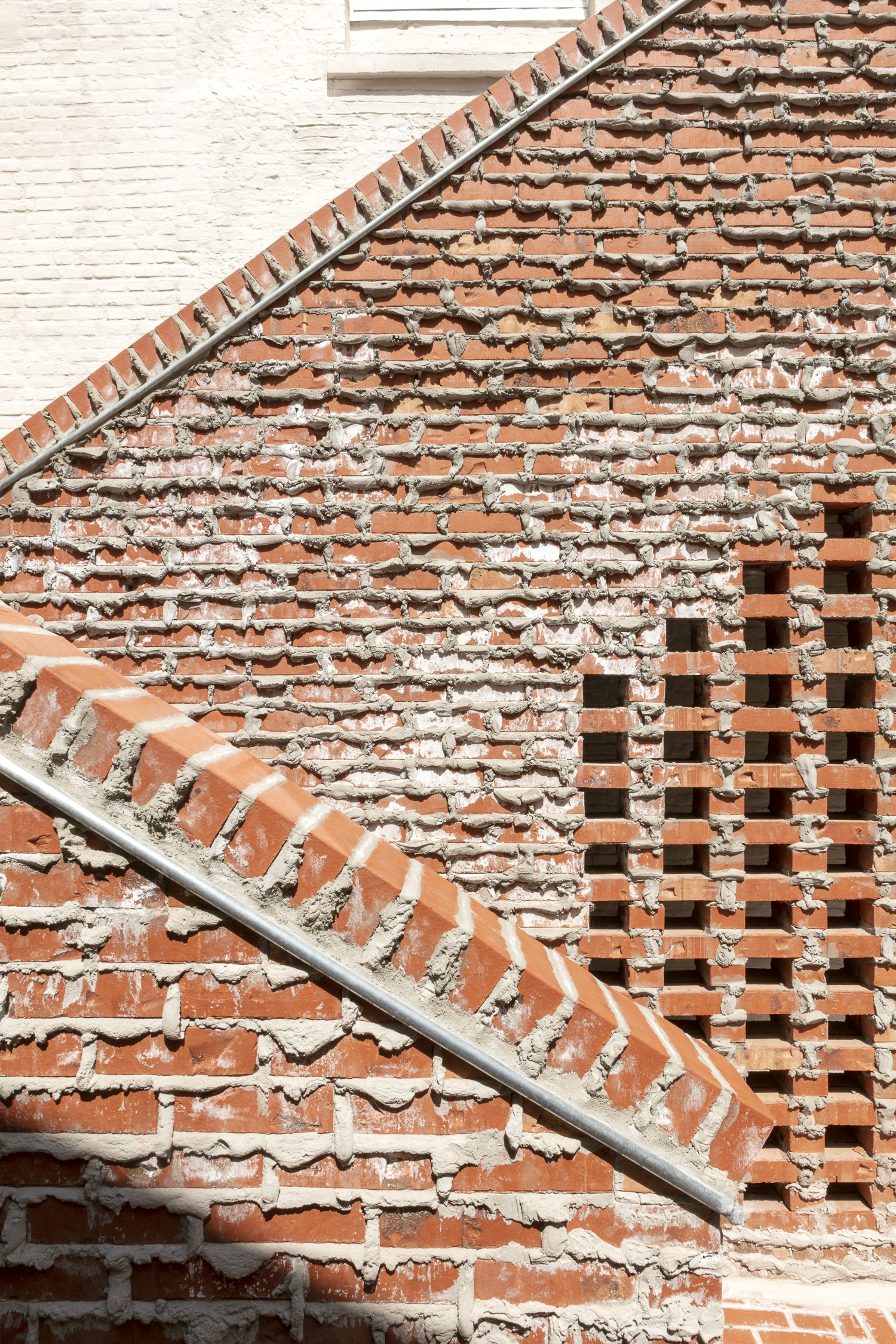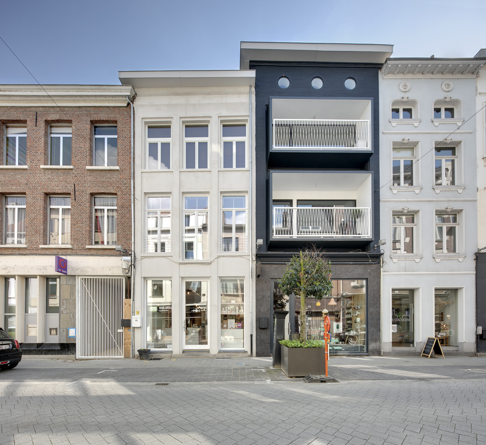 Aan de Onze-Lieve-Vrouwestraat zijn er twee 19de eeuwse gebouwen met winkelruimtes op de benedenverdieping. Achter en boven de winkels bevinden zich 6 woonentiteiten, waaronder een nieuwbouw met twee triplexwoningen. De nieuwbouw dient als katalysator voor de gehele site: het is een bakstenen monoliet met buitentrappen die, in samenwerking met de stegen en de patio’s, voor nieuwe circulatie op de site zorgen teruggrijpend naar het Moriaenstraatje. Via de trappenconstructie zijn de woningen boven en achter de winkelruimtes opnieuw bereikbaar. Het gebouw is een overtreffende trap in baksteensteenarchitectuur, die met zijn tactiliteit opvalt door de uitpuilende voegen in het metselwerk. Naast de nieuwbouw bevindt zich een gerestaureerd erkerhuis uit de 18de eeuw waarin ook een triplexwoning is ondergebracht.