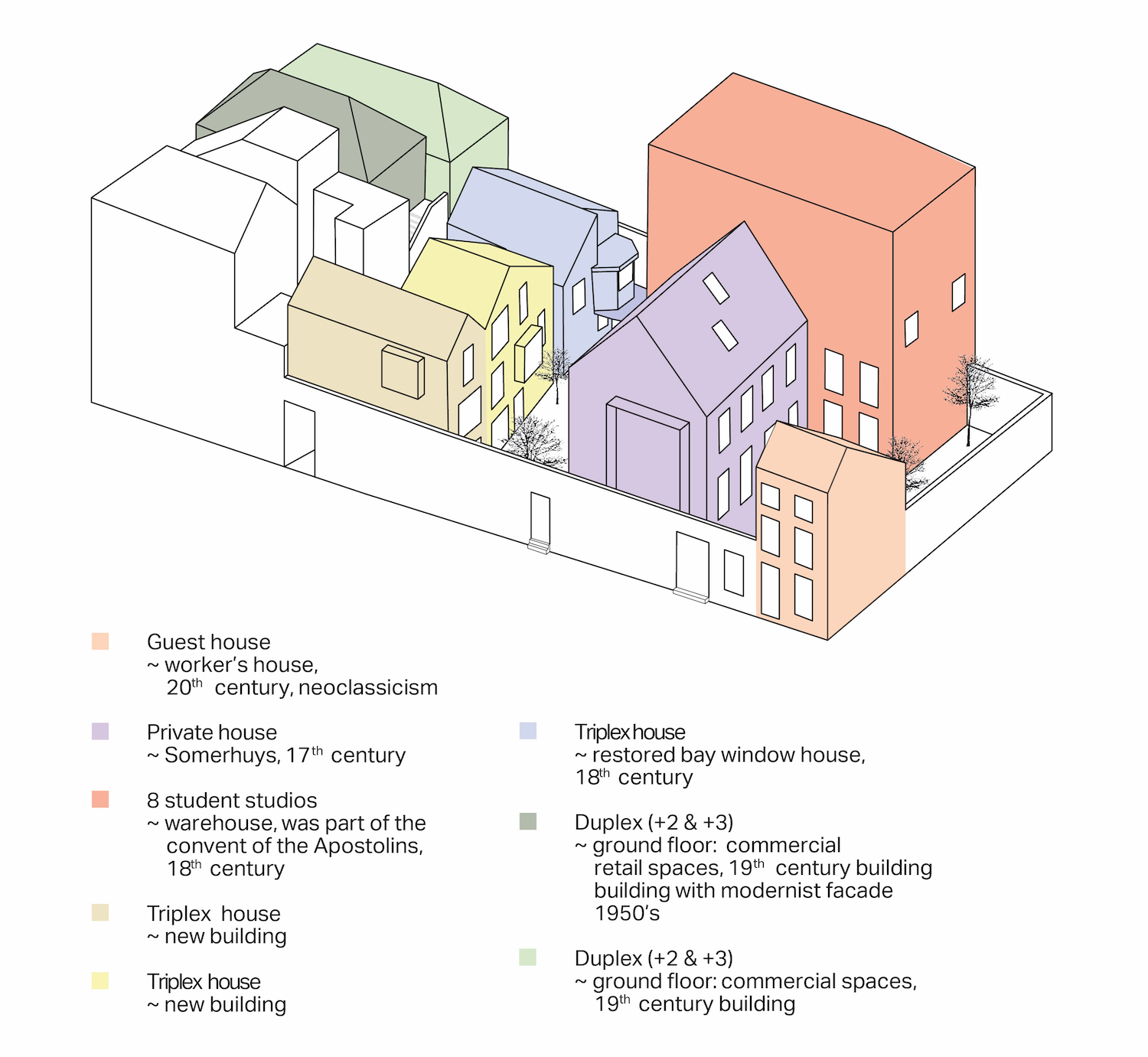 Op de site kunnen we zeven entiteiten onderscheiden: Het Somerhuys (17de eeuw), gerestaureerd en dient als privéwoning; een arbeiderswoning (20ste eeuw), gastverblijf in de privétuin van het Somerhuys; het Pakhuis (18de eeuw), basisonderdeel van het klooster van de Apostolinnen, bestaat nu uit 8 studentenstudio’s; een gerestaureerd erkerhuis (18de eeuw), twee 19de eeuws gebouwen met op de gelijkvloers winkelruimtes en boven 4 woonentiteiten; en tenslotte een nieuwbouw met 2 triplexwoningen.